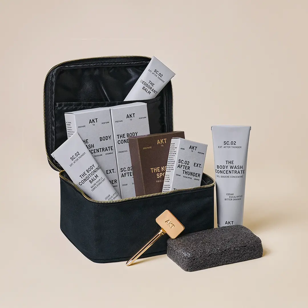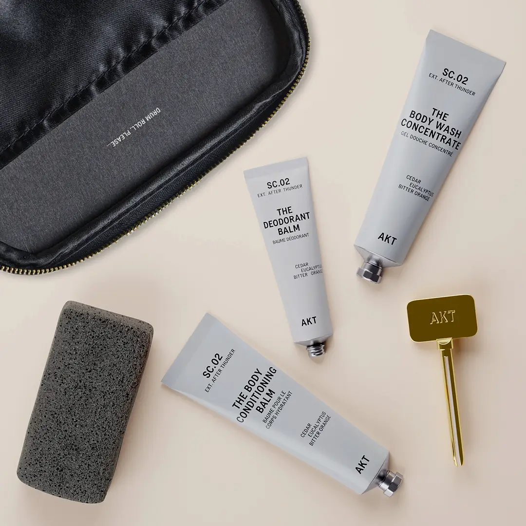 The Ensemble Set brings together five high-performance essentials in our iconic fragrance SC.02 EXT. AFTER THUNDER: woody, crisp, with notes of cedar eucalyptus and bitter orange — a walk through a rain-soaked forest, watching orange sunlight scatter across damp cedar.