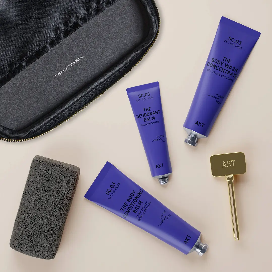 The Ensemble Set brings together five high-performance essentials in our iconic fragrance SC.03 EXT. THE ONSEN: aromatic, earthy with notes of vetiver, lavandin and yuzu — warm lavender sunlight cutting through the fragrant steam of a Japanese hot spring.